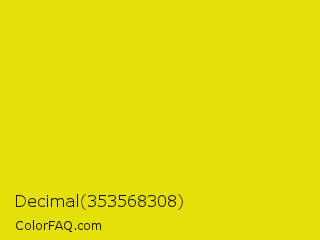 Decimal 353568308 Color is a normal yellow color and the nearest color is Peridot #e6e200. Hex code #e6e00a and RGB value is rgb(230,224,10). In RGB color space, this color is composed of 90% red, 88% green, 4% blue, In CMYK color space, this color is composed of 0% cyan, 3% magenta, 96% yellow , 10% black , In HSL color space, this color has a hue angle of 58° , 92% saturation and 47% lightness.