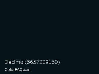 Decimal 5657229160 Color is a almost black cyan color and the nearest color is Blue Charcoal #010d1a. Hex code #051418 and RGB value is rgb(5,20,24). In RGB color space, this color is composed of 2% red, 8% green, 9% blue, In CMYK color space, this color is composed of 79% cyan, 17% magenta, 0% yellow , 91% black , In HSL color space, this color has a hue angle of 193° , 66% saturation and 6% lightness.