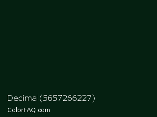 Decimal 5657266227 Color is a almost black green color and the nearest color is Palm Green #09230f. Hex code #052011 and RGB value is rgb(5,32,17). In RGB color space, this color is composed of 2% red, 13% green, 7% blue, In CMYK color space, this color is composed of 84% cyan, 0% magenta, 47% yellow , 87% black , In HSL color space, this color has a hue angle of 147° , 73% saturation and 7% lightness.