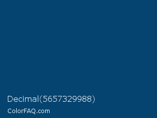 Decimal 5657329988 Color is a dark blue color and the nearest color is Deep Imperial Blue #00416a. Hex code #054470 and RGB value is rgb(5,68,112). In RGB color space, this color is composed of 2% red, 27% green, 44% blue, In CMYK color space, this color is composed of 96% cyan, 39% magenta, 0% yellow , 56% black , In HSL color space, this color has a hue angle of 205° , 91% saturation and 23% lightness.