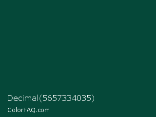 Decimal 5657334035 Color is a very dark cyan color and the nearest color is Aqua Deep #014b43. Hex code #054839 and RGB value is rgb(5,72,57). In RGB color space, this color is composed of 2% red, 28% green, 22% blue, In CMYK color space, this color is composed of 93% cyan, 0% magenta, 21% yellow , 72% black , In HSL color space, this color has a hue angle of 167° , 87% saturation and 15% lightness.