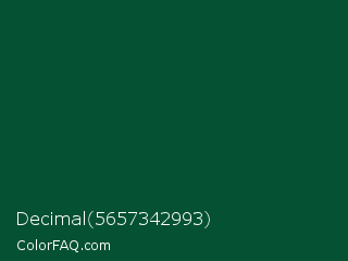 Decimal 5657342993 Color is a very dark green color and the nearest color is Sacramento State Green #00563f. Hex code #055133 and RGB value is rgb(5,81,51). In RGB color space, this color is composed of 2% red, 32% green, 20% blue, In CMYK color space, this color is composed of 94% cyan, 0% magenta, 37% yellow , 68% black , In HSL color space, this color has a hue angle of 156° , 88% saturation and 17% lightness.
