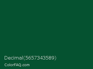 Decimal 5657343589 Color is a very dark green color and the nearest color is Sacramento State Green #00563f. Hex code #055231 and RGB value is rgb(5,82,49). In RGB color space, this color is composed of 2% red, 32% green, 19% blue, In CMYK color space, this color is composed of 94% cyan, 0% magenta, 40% yellow , 68% black , In HSL color space, this color has a hue angle of 154° , 89% saturation and 17% lightness.