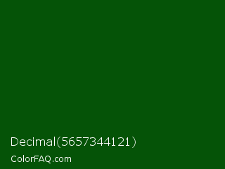 Decimal 5657344121 Color is a very dark green color and the nearest color is Dark Fern #0a480d. Hex code #055307 and RGB value is rgb(5,83,7). In RGB color space, this color is composed of 2% red, 33% green, 3% blue, In CMYK color space, this color is composed of 94% cyan, 0% magenta, 92% yellow , 67% black , In HSL color space, this color has a hue angle of 122° , 89% saturation and 17% lightness.