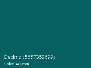 Decimal 5657359699 Color is a very dark cyan color and the nearest color is Blue Stone #016162. Hex code #056161 and RGB value is rgb(5,97,97). In RGB color space, this color is composed of 2% red, 38% green, 38% blue, In CMYK color space, this color is composed of 95% cyan, 0% magenta, 0% yellow , 62% black , In HSL color space, this color has a hue angle of 180° , 90% saturation and 20% lightness.