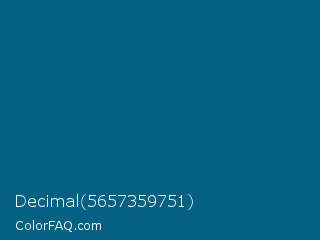 Decimal 5657359751 Color is a dark blue color and the nearest color is Orient #015e85. Hex code #056183 and RGB value is rgb(5,97,131). In RGB color space, this color is composed of 2% red, 38% green, 51% blue, In CMYK color space, this color is composed of 96% cyan, 26% magenta, 0% yellow , 49% black , In HSL color space, this color has a hue angle of 196° , 93% saturation and 27% lightness.