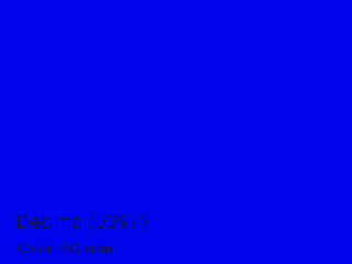Decimal 5397 Color is a normal blue color and the nearest color is Blue #0000ff. Hex code #0005eb and RGB value is rgb(0,5,235). In RGB color space, this color is composed of 0% red, 2% green, 92% blue, In CMYK color space, this color is composed of 100% cyan, 98% magenta, 0% yellow , 8% black , In HSL color space, this color has a hue angle of 239° , 100% saturation and 46% lightness.