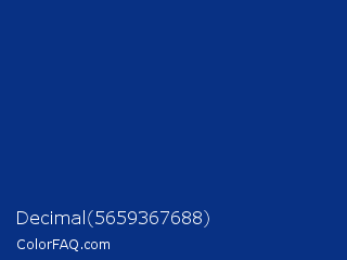 Decimal 5659367688 Color is a dark blue color and the nearest color is Air Force Blue USAF #00308f. Hex code #083184 and RGB value is rgb(8,49,132). In RGB color space, this color is composed of 3% red, 19% green, 52% blue, In CMYK color space, this color is composed of 94% cyan, 63% magenta, 0% yellow , 48% black , In HSL color space, this color has a hue angle of 220° , 89% saturation and 27% lightness.
