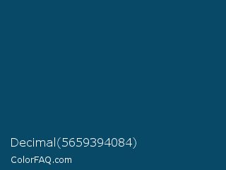 Decimal 5659394084 Color is a very dark blue color and the nearest color is Deep Imperial Blue #00416a. Hex code #084968 and RGB value is rgb(8,73,104). In RGB color space, this color is composed of 3% red, 29% green, 41% blue, In CMYK color space, this color is composed of 92% cyan, 30% magenta, 0% yellow , 59% black , In HSL color space, this color has a hue angle of 199° , 86% saturation and 22% lightness.