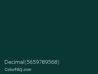 Decimal 5659789568 Color is a very dark cyan color and the nearest color is Tiber #063537. Hex code #093734 and RGB value is rgb(9,55,52). In RGB color space, this color is composed of 4% red, 22% green, 20% blue, In CMYK color space, this color is composed of 84% cyan, 0% magenta, 5% yellow , 78% black , In HSL color space, this color has a hue angle of 176° , 72% saturation and 13% lightness.