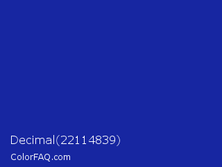 Decimal 22114839 Color is a normal blue color and the nearest color is Torea Bay #0f2d9e. Hex code #1726a1 and RGB value is rgb(23,38,161). In RGB color space, this color is composed of 9% red, 15% green, 63% blue, In CMYK color space, this color is composed of 86% cyan, 76% magenta, 0% yellow , 37% black , In HSL color space, this color has a hue angle of 233° , 75% saturation and 36% lightness.