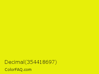 Decimal 354418697 Color is a normal yellow color and the nearest color is Titanium Yellow #eee600. Hex code #e7ef09 and RGB value is rgb(231,239,9). In RGB color space, this color is composed of 91% red, 94% green, 4% blue, In CMYK color space, this color is composed of 3% cyan, 0% magenta, 96% yellow , 6% black , In HSL color space, this color has a hue angle of 62° , 93% saturation and 49% lightness.