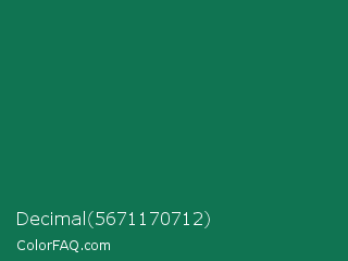 Decimal 5671170712 Color is a dark green color and the nearest color is Watercourse #056f57. Hex code #107452 and RGB value is rgb(16,116,82). In RGB color space, this color is composed of 6% red, 45% green, 32% blue, In CMYK color space, this color is composed of 86% cyan, 0% magenta, 29% yellow , 55% black , In HSL color space, this color has a hue angle of 160° , 76% saturation and 26% lightness.