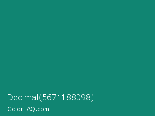 Decimal 5671188098 Color is a dark cyan color and the nearest color is Elf Green #088370. Hex code #108572 and RGB value is rgb(16,133,114). In RGB color space, this color is composed of 6% red, 52% green, 45% blue, In CMYK color space, this color is composed of 88% cyan, 0% magenta, 14% yellow , 48% black , In HSL color space, this color has a hue angle of 170° , 79% saturation and 29% lightness.