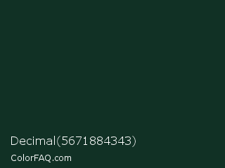 Decimal 5671884343 Color is a very dark green color and the nearest color is Phthalo Green #123524. Hex code #113125 and RGB value is rgb(17,49,37). In RGB color space, this color is composed of 7% red, 19% green, 15% blue, In CMYK color space, this color is composed of 65% cyan, 0% magenta, 24% yellow , 81% black , In HSL color space, this color has a hue angle of 158° , 48% saturation and 13% lightness.