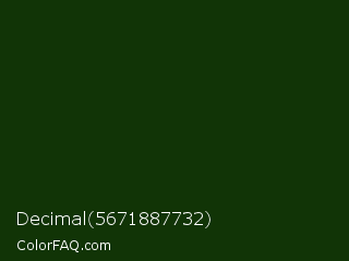 Decimal 5671887732 Color is a very dark green color and the nearest color is Deep Forest Green #182d09. Hex code #113406 and RGB value is rgb(17,52,6). In RGB color space, this color is composed of 7% red, 20% green, 2% blue, In CMYK color space, this color is composed of 67% cyan, 0% magenta, 88% yellow , 80% black , In HSL color space, this color has a hue angle of 106° , 79% saturation and 11% lightness.