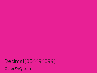 Decimal 354494099 Color is a normal magenta color and the nearest color is Barbie Pink #e0218a. Hex code #e82095 and RGB value is rgb(232,32,149). In RGB color space, this color is composed of 91% red, 13% green, 58% blue, In CMYK color space, this color is composed of 0% cyan, 86% magenta, 36% yellow , 9% black , In HSL color space, this color has a hue angle of 325° , 81% saturation and 52% lightness.
