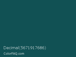 Decimal 5671917686 Color is a very dark cyan color and the nearest color is Eden #105852. Hex code #115154 and RGB value is rgb(17,81,84). In RGB color space, this color is composed of 7% red, 32% green, 33% blue, In CMYK color space, this color is composed of 80% cyan, 4% magenta, 0% yellow , 67% black , In HSL color space, this color has a hue angle of 183° , 66% saturation and 20% lightness.
