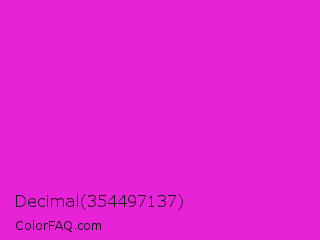 Decimal 354497137 Color is a normal magenta color and the nearest color is Hot Magenta #ff1dce. Hex code #e822d7 and RGB value is rgb(232,34,215). In RGB color space, this color is composed of 91% red, 13% green, 84% blue, In CMYK color space, this color is composed of 0% cyan, 85% magenta, 7% yellow , 9% black , In HSL color space, this color has a hue angle of 305° , 81% saturation and 52% lightness.