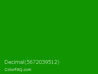 Decimal 5672039512 Color is a dark green color and the nearest color is India Green #138808. Hex code #119602 and RGB value is rgb(17,150,2). In RGB color space, this color is composed of 7% red, 59% green, 1% blue, In CMYK color space, this color is composed of 89% cyan, 0% magenta, 99% yellow , 41% black , In HSL color space, this color has a hue angle of 114° , 97% saturation and 30% lightness.