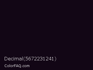 Decimal 5672231241 Color is a almost black purple color and the nearest color is Cinder #0e0e18. Hex code #120615 and RGB value is rgb(18,6,21). In RGB color space, this color is composed of 7% red, 2% green, 8% blue, In CMYK color space, this color is composed of 14% cyan, 71% magenta, 0% yellow , 92% black , In HSL color space, this color has a hue angle of 288° , 56% saturation and 5% lightness.