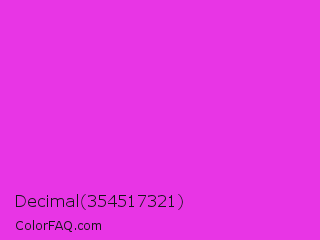 Decimal 354517321 Color is a normal magenta color and the nearest color is Razzle Dazzle Rose #ff33cc. Hex code #e835e5 and RGB value is rgb(232,53,229). In RGB color space, this color is composed of 91% red, 21% green, 90% blue, In CMYK color space, this color is composed of 0% cyan, 77% magenta, 1% yellow , 9% black , In HSL color space, this color has a hue angle of 301° , 80% saturation and 56% lightness.