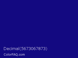 Decimal 5673067873 Color is a dark indigo color and the nearest color is Deep Koamaru #1b127b. Hex code #130981 and RGB value is rgb(19,9,129). In RGB color space, this color is composed of 7% red, 4% green, 51% blue, In CMYK color space, this color is composed of 85% cyan, 93% magenta, 0% yellow , 49% black , In HSL color space, this color has a hue angle of 245° , 87% saturation and 27% lightness.
