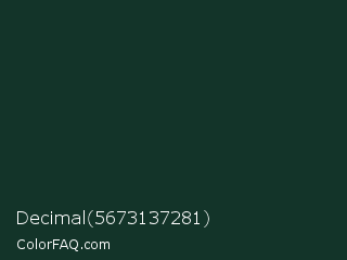 Decimal 5673137281 Color is a very dark green color and the nearest color is Timber Green #16322c. Hex code #133429 and RGB value is rgb(19,52,41). In RGB color space, this color is composed of 7% red, 20% green, 16% blue, In CMYK color space, this color is composed of 63% cyan, 0% magenta, 21% yellow , 80% black , In HSL color space, this color has a hue angle of 160° , 46% saturation and 14% lightness.
