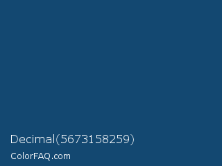 Decimal 5673158259 Color is a dark blue color and the nearest color is Chathams Blue #175579. Hex code #134871 and RGB value is rgb(19,72,113). In RGB color space, this color is composed of 7% red, 28% green, 44% blue, In CMYK color space, this color is composed of 83% cyan, 36% magenta, 0% yellow , 56% black , In HSL color space, this color has a hue angle of 206° , 71% saturation and 26% lightness.