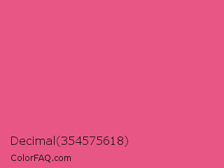 Decimal 354575618 Color is a light rose color and the nearest color is Dark Pink #e75480. Hex code #e85686 and RGB value is rgb(232,86,134). In RGB color space, this color is composed of 91% red, 34% green, 53% blue, In CMYK color space, this color is composed of 0% cyan, 63% magenta, 42% yellow , 9% black , In HSL color space, this color has a hue angle of 340° , 76% saturation and 62% lightness.
