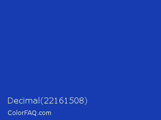 Decimal 22161508 Color is a normal blue color and the nearest color is Persian Blue #1c39bb. Hex code #173cb0 and RGB value is rgb(23,60,176). In RGB color space, this color is composed of 9% red, 24% green, 69% blue, In CMYK color space, this color is composed of 87% cyan, 66% magenta, 0% yellow , 31% black , In HSL color space, this color has a hue angle of 225° , 77% saturation and 39% lightness.