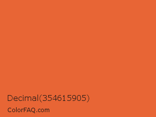 Decimal 354615905 Color is a normal orange color and the nearest color is Deep Carrot Orange #e9692c. Hex code #e86535 and RGB value is rgb(232,101,53). In RGB color space, this color is composed of 91% red, 40% green, 21% blue, In CMYK color space, this color is composed of 0% cyan, 56% magenta, 77% yellow , 9% black , In HSL color space, this color has a hue angle of 16° , 80% saturation and 56% lightness.