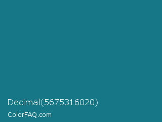 Decimal 5675316020 Color is a normal cyan color and the nearest color is Elm #1c7c7d. Hex code #167786 and RGB value is rgb(22,119,134). In RGB color space, this color is composed of 9% red, 47% green, 53% blue, In CMYK color space, this color is composed of 84% cyan, 11% magenta, 0% yellow , 47% black , In HSL color space, this color has a hue angle of 188° , 72% saturation and 31% lightness.