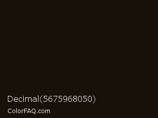 Decimal 5675968050 Color is a almost black orange color and the nearest color is Crowshead #1c1208. Hex code #171108 and RGB value is rgb(23,17,8). In RGB color space, this color is composed of 9% red, 7% green, 3% blue, In CMYK color space, this color is composed of 0% cyan, 26% magenta, 65% yellow , 91% black , In HSL color space, this color has a hue angle of 36° , 48% saturation and 6% lightness.