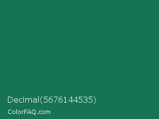 Decimal 5676144535 Color is a dark green color and the nearest color is Dark Spring Green #177245. Hex code #177355 and RGB value is rgb(23,115,85). In RGB color space, this color is composed of 9% red, 45% green, 33% blue, In CMYK color space, this color is composed of 80% cyan, 0% magenta, 26% yellow , 55% black , In HSL color space, this color has a hue angle of 160° , 67% saturation and 27% lightness.