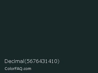 Decimal 5676431410 Color is a very dark cyan color and the nearest color is Dark Gunmetal #1f262a. Hex code #182728 and RGB value is rgb(24,39,40). In RGB color space, this color is composed of 9% red, 15% green, 16% blue, In CMYK color space, this color is composed of 40% cyan, 3% magenta, 0% yellow , 84% black , In HSL color space, this color has a hue angle of 184° , 25% saturation and 13% lightness.