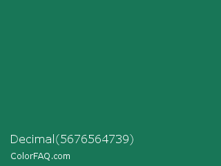 Decimal 5676564739 Color is a dark green color and the nearest color is Deep Green Cyan Turquoise #0e7c61. Hex code #187657 and RGB value is rgb(24,118,87). In RGB color space, this color is composed of 9% red, 46% green, 34% blue, In CMYK color space, this color is composed of 80% cyan, 0% magenta, 26% yellow , 54% black , In HSL color space, this color has a hue angle of 160° , 66% saturation and 28% lightness.