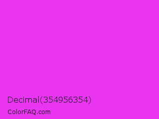 Decimal 354956354 Color is a normal magenta color and the nearest color is Purple Pizzazz #fe4eda. Hex code #e934f2 and RGB value is rgb(233,52,242). In RGB color space, this color is composed of 91% red, 20% green, 95% blue, In CMYK color space, this color is composed of 4% cyan, 79% magenta, 0% yellow , 5% black , In HSL color space, this color has a hue angle of 297° , 88% saturation and 58% lightness.