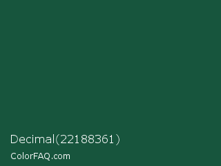 Decimal 22188361 Color is a very dark green color and the nearest color is Brunswick Green #1b4d3e. Hex code #17553d and RGB value is rgb(23,85,61). In RGB color space, this color is composed of 9% red, 33% green, 24% blue, In CMYK color space, this color is composed of 73% cyan, 0% magenta, 28% yellow , 67% black , In HSL color space, this color has a hue angle of 157° , 57% saturation and 21% lightness.