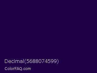 Decimal 5688074599 Color is a very dark violet color and the nearest color is Tolopea #1b0245. Hex code #200047 and RGB value is rgb(32,0,71). In RGB color space, this color is composed of 13% red, 0% green, 28% blue, In CMYK color space, this color is composed of 55% cyan, 100% magenta, 0% yellow , 72% black , In HSL color space, this color has a hue angle of 267° , 100% saturation and 14% lightness.