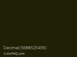 Decimal 5688525459 Color is a almost black yellow color and the nearest color is Pine Tree #171f04. Hex code #202005 and RGB value is rgb(32,32,5). In RGB color space, this color is composed of 13% red, 13% green, 2% blue, In CMYK color space, this color is composed of 0% cyan, 0% magenta, 84% yellow , 87% black , In HSL color space, this color has a hue angle of 60° , 73% saturation and 7% lightness.