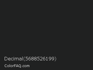 Decimal 5688526199 Color is a very dark cyan color and the nearest color is Raisin Black #242124. Hex code #202121 and RGB value is rgb(32,33,33). In RGB color space, this color is composed of 13% red, 13% green, 13% blue, In CMYK color space, this color is composed of 3% cyan, 0% magenta, 0% yellow , 87% black , In HSL color space, this color has a hue angle of 180° , 2% saturation and 13% lightness.