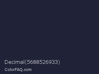 Decimal 5688526933 Color is a very dark blue color and the nearest color is Steel Gray #262335. Hex code #202237 and RGB value is rgb(32,34,55). In RGB color space, this color is composed of 13% red, 13% green, 22% blue, In CMYK color space, this color is composed of 42% cyan, 38% magenta, 0% yellow , 78% black , In HSL color space, this color has a hue angle of 235° , 26% saturation and 17% lightness.