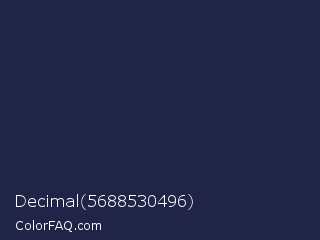 Decimal 5688530496 Color is a very dark blue color and the nearest color is Yankees Blue #1c2841. Hex code #202548 and RGB value is rgb(32,37,72). In RGB color space, this color is composed of 13% red, 15% green, 28% blue, In CMYK color space, this color is composed of 56% cyan, 49% magenta, 0% yellow , 72% black , In HSL color space, this color has a hue angle of 233° , 38% saturation and 20% lightness.