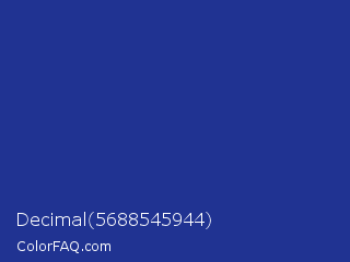 Decimal 5688545944 Color is a normal blue color and the nearest color is Cosmic Cobalt #2e2d88. Hex code #203392 and RGB value is rgb(32,51,146). In RGB color space, this color is composed of 13% red, 20% green, 57% blue, In CMYK color space, this color is composed of 78% cyan, 65% magenta, 0% yellow , 43% black , In HSL color space, this color has a hue angle of 230° , 64% saturation and 35% lightness.