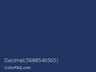 Decimal 5688546565 Color is a dark blue color and the nearest color is Biscay #1b3162. Hex code #203461 and RGB value is rgb(32,52,97). In RGB color space, this color is composed of 13% red, 20% green, 38% blue, In CMYK color space, this color is composed of 67% cyan, 46% magenta, 0% yellow , 62% black , In HSL color space, this color has a hue angle of 222° , 50% saturation and 25% lightness.