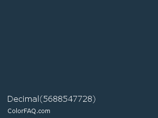 Decimal 5688547728 Color is a very dark blue color and the nearest color is Nile Blue #193751. Hex code #203646 and RGB value is rgb(32,54,70). In RGB color space, this color is composed of 13% red, 21% green, 27% blue, In CMYK color space, this color is composed of 54% cyan, 23% magenta, 0% yellow , 73% black , In HSL color space, this color has a hue angle of 205° , 37% saturation and 20% lightness.