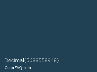 Decimal 5688558948 Color is a dark blue color and the nearest color is Blue Dianne #204852. Hex code #204054 and RGB value is rgb(32,64,84). In RGB color space, this color is composed of 13% red, 25% green, 33% blue, In CMYK color space, this color is composed of 62% cyan, 24% magenta, 0% yellow , 67% black , In HSL color space, this color has a hue angle of 203° , 45% saturation and 23% lightness.