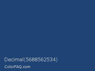 Decimal 5688562534 Color is a dark blue color and the nearest color is Astronaut #283a77. Hex code #204376 and RGB value is rgb(32,67,118). In RGB color space, this color is composed of 13% red, 26% green, 46% blue, In CMYK color space, this color is composed of 73% cyan, 43% magenta, 0% yellow , 54% black , In HSL color space, this color has a hue angle of 216° , 57% saturation and 29% lightness.