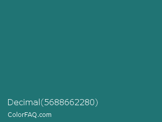 Decimal 5688662280 Color is a dark cyan color and the nearest color is Elm #1c7c7d. Hex code #207474 and RGB value is rgb(32,116,116). In RGB color space, this color is composed of 13% red, 45% green, 45% blue, In CMYK color space, this color is composed of 72% cyan, 0% magenta, 0% yellow , 55% black , In HSL color space, this color has a hue angle of 180° , 57% saturation and 29% lightness.
